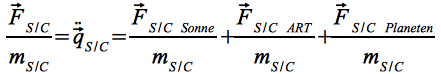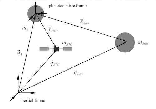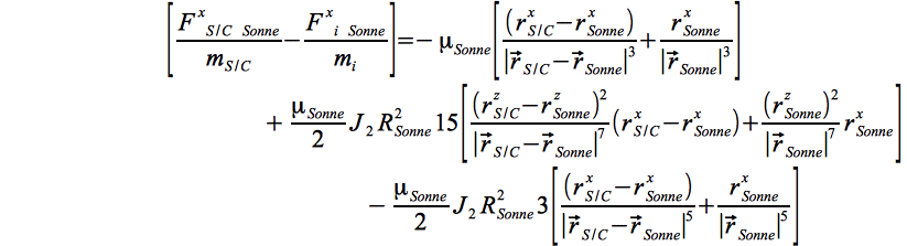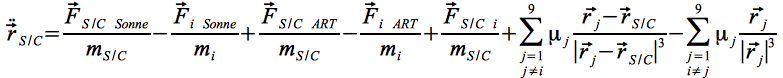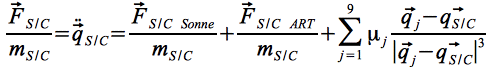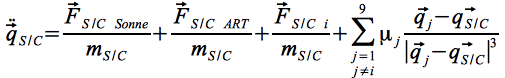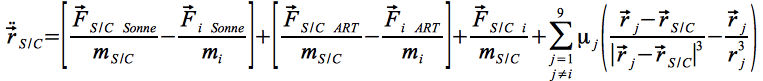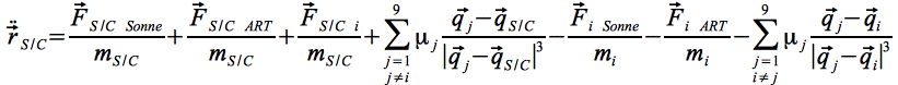 Nachdem mit Eq.12 die Bewegung des Planeten in heliozentrischen Koordinaten beschrieben wird, soll nun die Bewegung der Sonde relativ zum Planeten untersucht werden. Ausgangspunkt ist hierbei, analog zu Eq.9, die Beschreibung der Bewegung in einem Inertialsystem, wobei in diesem Fall der Satellit als zehnte Größe hinzu kommt: