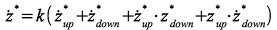 Mit Eq.48 lässt sich die Frequenzänderung für einen Signalweg bestimmen. Möchte man die relative Frequenzänderung auch unter Berücksichtigung einer Frequenzumsetzung k an Bord des Satelliten für einen Zweiwegemodus berechnen, gilt es, z*up und z*down aus den Positionen und Geschwindigkeiten von Satellit und Bodenstation unter Beachtung der Signallaufzeit zu bestimmen.