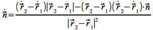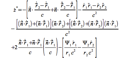 In Eq.48 treten die heliozentrischen Orts- und Geschwindigkeitsvektoren des Senders (1) und des Empfängers (2) auf. Es ist hierbei zu beachten, dass diese nicht zum gleichen Zeitpunkt gelten. Ein zum Zeitpunkt t0 abgestrahltes Signal benötigt eine Laufzeit Δt bis es den Empfänger erreicht, so dass das Signal erst zum Zeitpunkt t0+Δt empfangen wird.