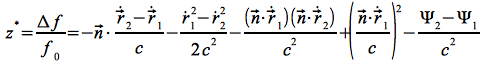 Die gesamte relative Frequenzverschiebung unter Berücksichtigung der Relativbewegung von Sender und Empfänger sowie der eben beschriebenen Gravitationsrotverschiebung führt auf folgende Beschreibung [23]: